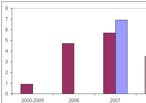 Не слишком благоприятно обстоят дела и в других крупнейших мировых экономиках. В январе широко обсуждается вопрос о том, окажется ли в 2008 году в состоянии рецессии Япония. В странах Евросоюза возможности продолжать экономический рост темпами, превышающими 3%, характерными для 2006–2007 годов, ограничиваются влиянием укрепления курса евро по отношению к доллару, осложняющим экспорт из еврозоны, и высокой (по европейским стандартам) инфляцией, не позволяющей снизить базовую процентную ставку для ускорения роста экономики. Индия в меньшей степени, чем Китай и Евросоюз, зависит от мировой конъюнктуры. Но и здесь прогнозируется замедление темпов экономического роста (в 2008 году по отношению к 2006 году – на 1%).