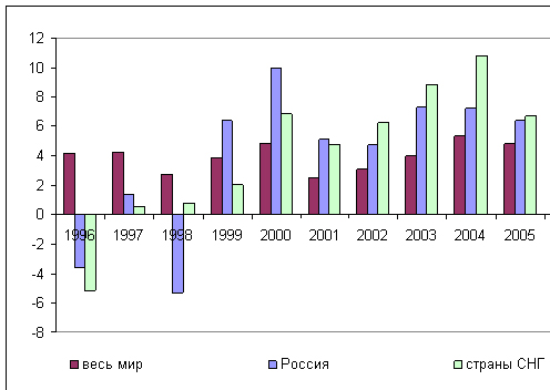 Темпы прироста мирового ВВП, ВВП России и стран СНГ без России, 1996–2007 гг. (в % к предыдущему году)