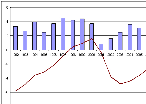 Динамика ВВП, % к предшествующему периоду, дефицит/профицит бюджета расширенного правительства США, % ВВП, 1992–2008 гг.