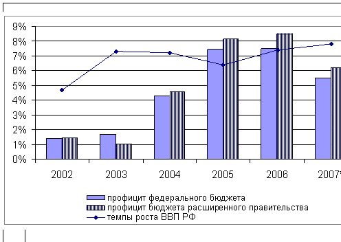 Исполнение федерального бюджета и бюджета расширенного правительства РФ (левая шкала) и темпы прироста ВВП РФ (правая шкала), 2002–2007 гг.