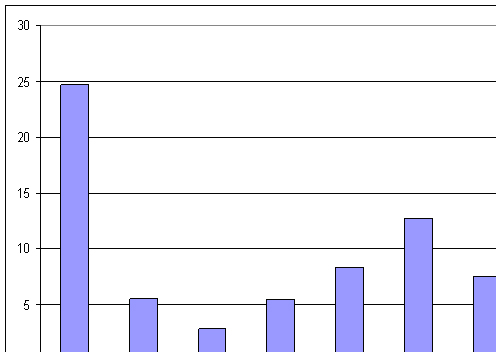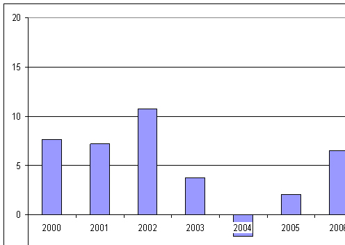 Колебания темпов экономического роста меняют ситуацию на рынках важных для России экспортных продуктов: нефти, нефтепродуктов, газа и металлов. В 1998 году темпы экономического роста в мире упали на 1,4%, масштабы падения цен на металлы измерялись двузначными числами. То же происходило в 2001 году – мягкая рецессия в США, падение мирового ВВП на 2,3%, переход от роста цен на нефть в 60% в год к их падению более чем на 10%. Сходным образом во время рецессии развивается ситуация на рынке металлов (см. рис.7).