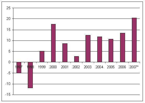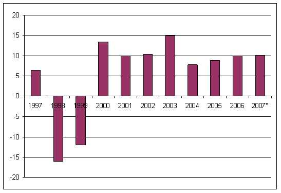 Темпы прироста инвестиций в основной капитал, 1997–2007 гг.