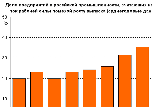 Это не единственный показатель, свидетельствующий о перегреве экономики. В стране начиная с 2004 года высокими темпами увеличивается заработная плата (в реальном исчислении). В 2007 году ее рост ускорился до 15% (см. рис. 19). Согласно опросам, которые ИЭПП проводит на протяжении многих лет, все больше руководителей предприятий жалуются на то, что дефицит рабочей силы – важнейшая преграда на пути роста выпуска продукции (см. рис. 20).