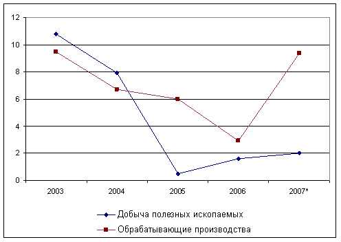 Темпы прироста выпуска в добывающих и обрабатывающих отраслях, 2003–2007 гг. (в % к предыдущему году)