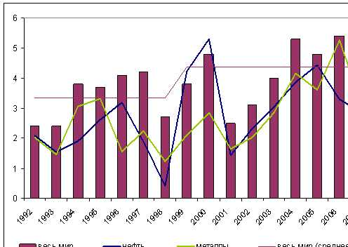 Темпы прироста мирового ВВП (левая шкала), динамика цен на нефть и металлы (правая шкала), 1992–2008 гг. (в % к предыдущему году)