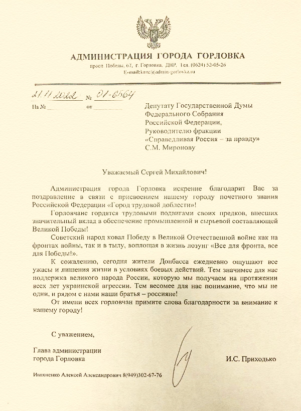 Председатель Партии СПРАВЕДЛИВАЯ РОССИЯ – ЗА ПРАВДУ, руководитель партийной фракции в Госдуме Сергей Миронов получил благодарность от лица администрации города Горловки Донецкой Народной Республики за поздравление в связи с присвоением городу почетного звания РФ "Город трудовой доблести".