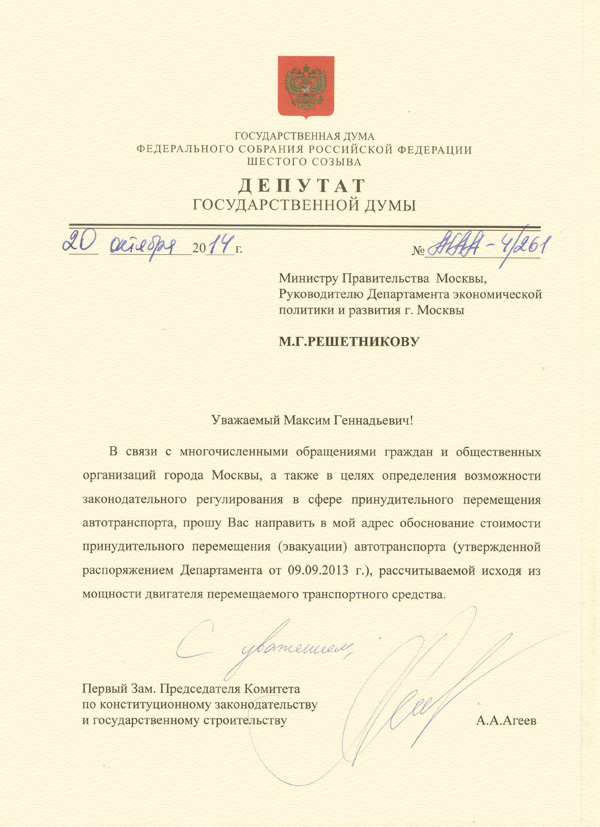 Депутат Госдумы, руководитель Регионального отделения Партии СПРАВЕДЛИВАЯ РОССИЯ в Москве Александр Агеев направил депутатский запрос руководителю Департамента экономической политики и развития Москвы Максиму Решетникову с просьбой обосновать стоимость принудительного перемещения (эвакуации) автотранспорта, рассчитываемой исходя из мощности двигателя перемещаемого транспортного средства. Тарифы был утверждены распоряжением Департамента от 09.09.2013 г.