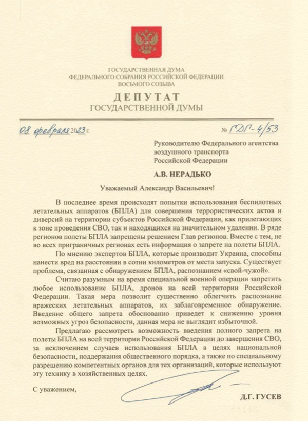 - Предлагаю ввести полный запрет на полеты беспилотников (БПЛА) на всей территории Российской Федерации до завершения СВО. Их использование оставить только в исключительных случая: в целях национальной безопасности, для поддержания общественного порядка, а также по специальному разрешению компетентных органов для тех организаций, которые используют эту технику в производственно-хозяйственных целях.