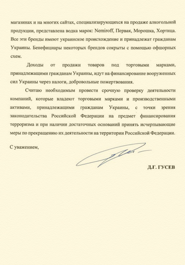 Дмитрий Гусев предлагает запретить продажу украинской продукции на территории РФ