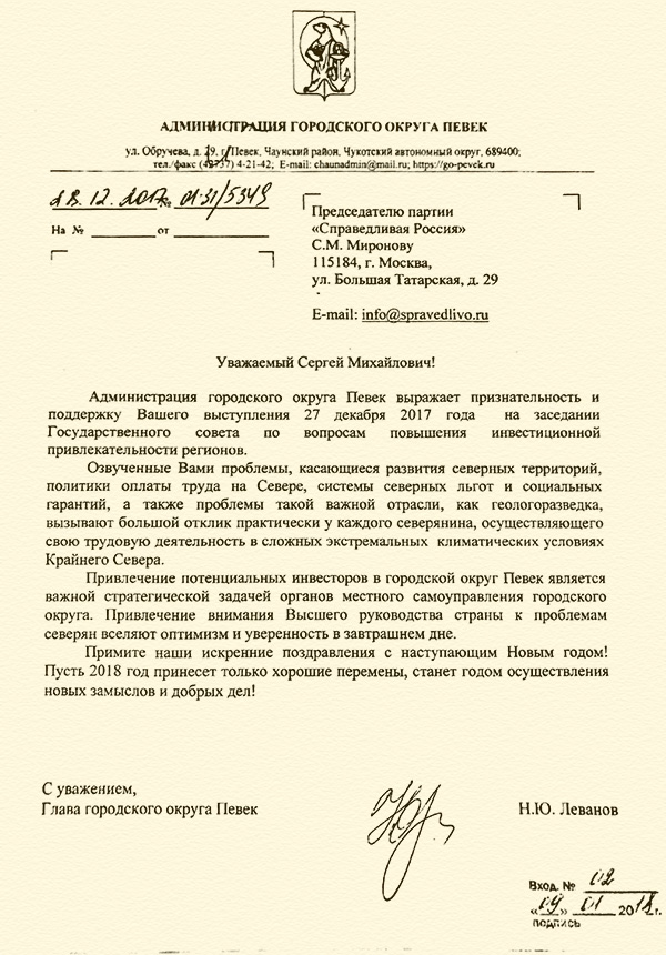 Глава городского округа Певек Чукотского автономного округа Николай Леванов выразил признательность Председателю Партии СПРАВЕДЛИВАЯ РОССИЯ, руководителю фракции "СР" в Госдуме Сергею Миронову за по проблемам северных территорий на заседании Государственного совета по вопросам повышения инвестиционной привлекательности регионов.