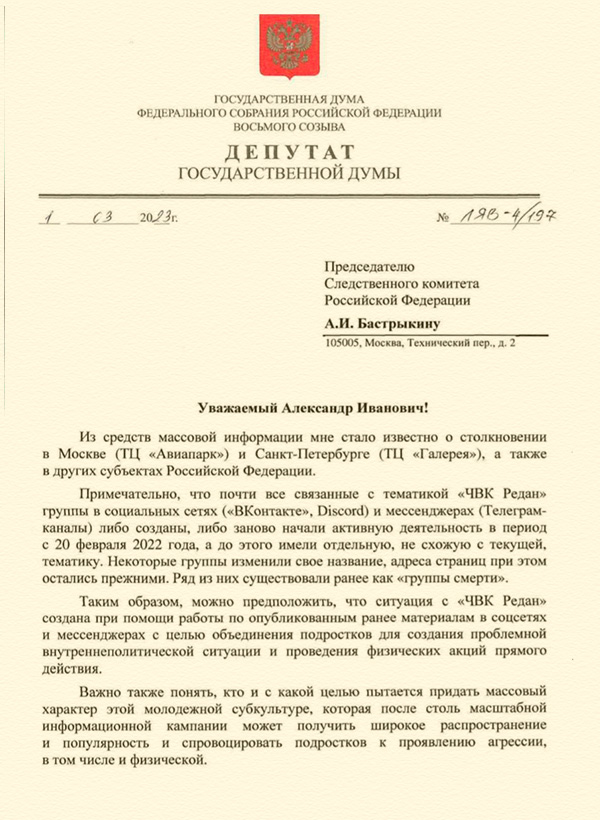 Первый заместитель председателя Комитета ГД по просвещению, депутат фракции "СПРАВЕДЛИВАЯ РОССИЯ – ЗА ПРАВДУ" Яна Лантратова направила главе Следственного комитета РФ Александру Бастрыкину обращение с просьбой установить в соцсетях администраторов групп, пропагандирующих среди несовершеннолетних деструктивное поведение. В частности, речь идёт о "ЧВК Рёдан".