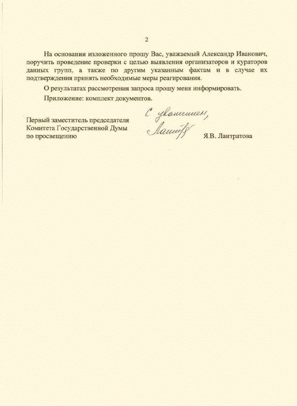Яна Лантратова обратилась к Александру Бастрыкину с просьбой найти администраторов групп, провоцирующих подростков на агрессию