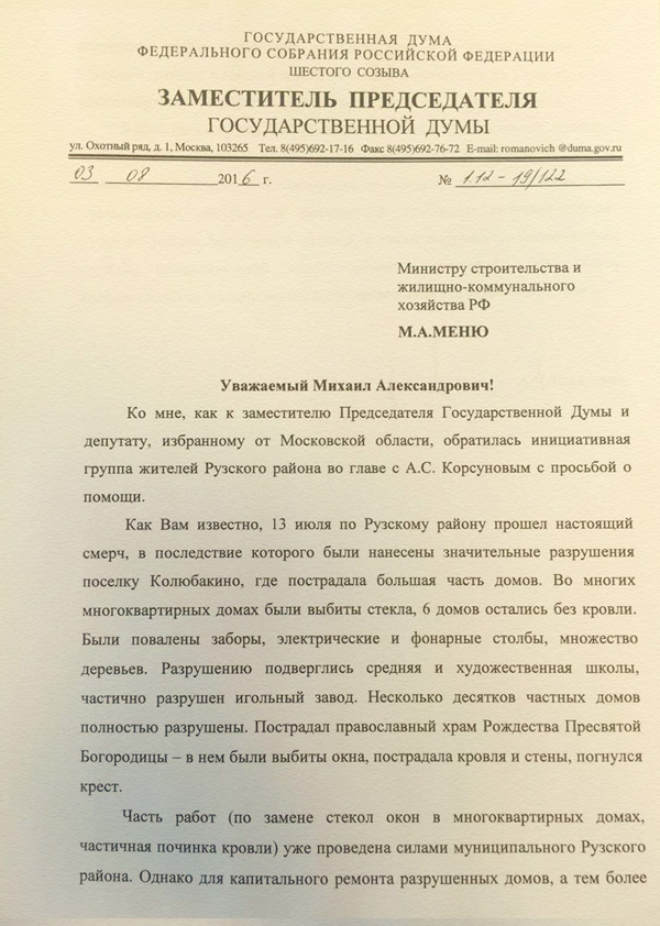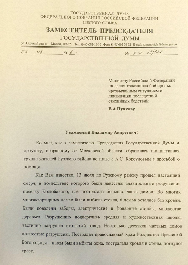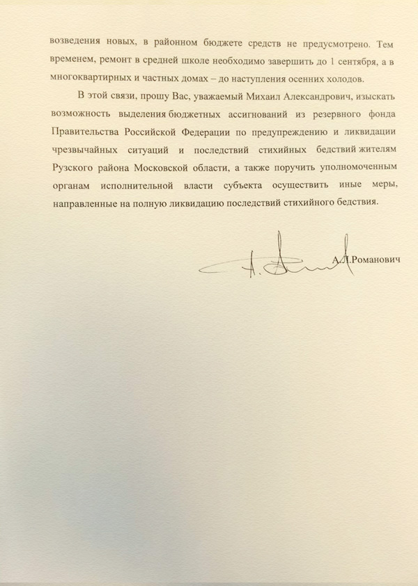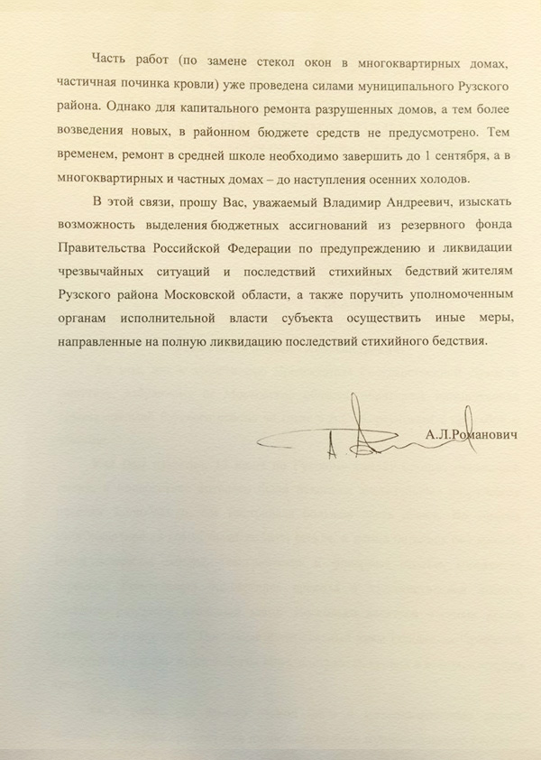 Александр Романович в своем обращении к Владимиру Пучкову и Михаилу Меню попросил выделить жителям Рузского района бюджетные ассигнования из резервного фонда Правительства РФ по предупреждению и ликвидации чрезвычайных ситуаций и последствий стихийных бедствий, а также поручить уполномоченным органам исполнительной власти субъекта РФ осуществить иные меры, направленные на полную ликвидацию последствий стихийного бедствия.