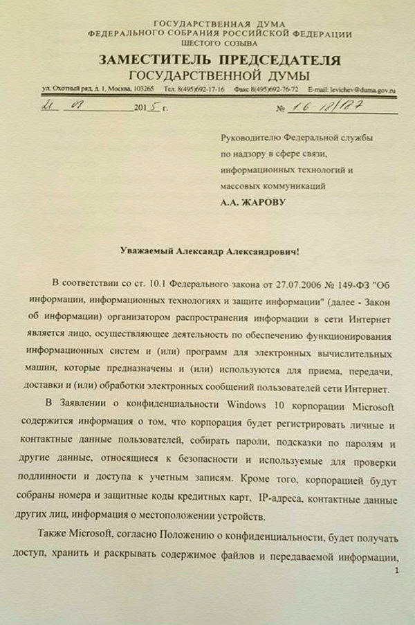 Согласно заявлению о конфиденциальности компании Microsoft, данные пользователей ее программных продуктов будут храниться в США или других странах, где представлена компания. В связи с этим Заместитель Председателя Государственной Думы Николай Левичев обратился к главе Роскомнадзора Александру Жарову с просьбой о проведении проверки соответствия деятельности корпорации Microsoft требованиям Закона об информации: