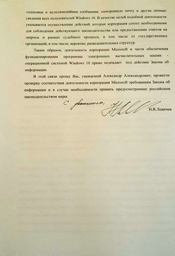 В этой связи прошу Вас, уважаемый Александр Александрович, провести проверку соответствия деятельности корпорации Microsoft требованиям Закона об информации и в случае необходимости принять предусмотренные российским законодательством меры.
