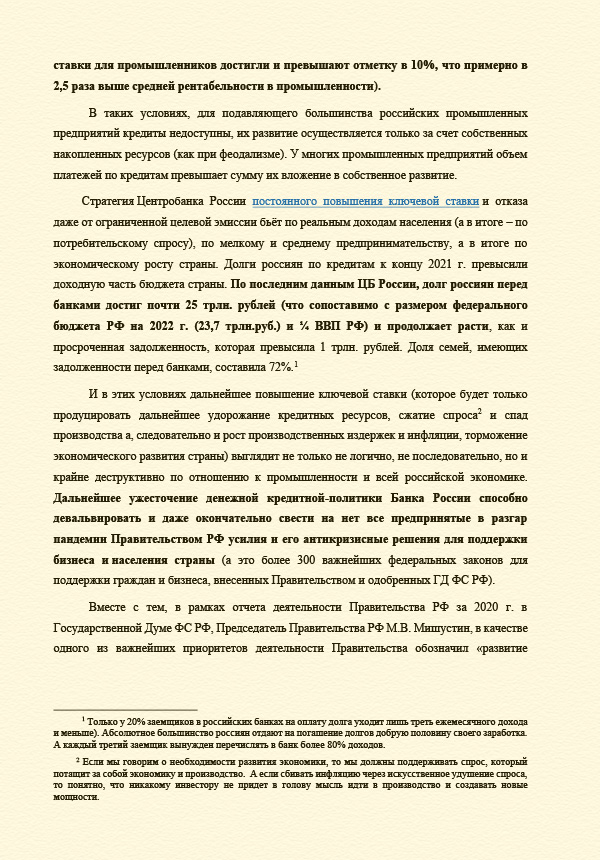 По его мнению, дальнейшее ужесточение денежно-кредитной политики Банка России способно девальвировать и даже окончательно "свести на нет" все предпринятые в разгар пандемии Правительством РФ усилия для поддержки бизнеса и населения страны.