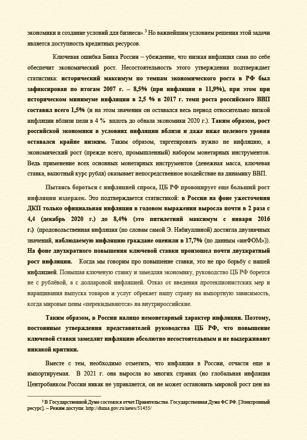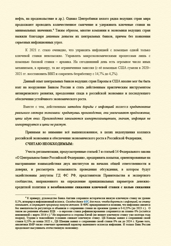 "Прошу оценить Банком России представленные доводы и обсудить с Государственной Думой, Правительством целесообразность и последствия увеличения ставки рефинансирования ЦБ и отказа от дальнейшего ужесточения денежно-кредитной политики и возобновлению снижения ключевой ставки с целью снижения конечных ставок по кредитным ресурсам до уровня не более 4%, то есть в пределах рентабельности большинства отраслей реального сектора (привязать регулирование ключевой ставки к рентабельности в производственной сфере)", – говорится в обращении.