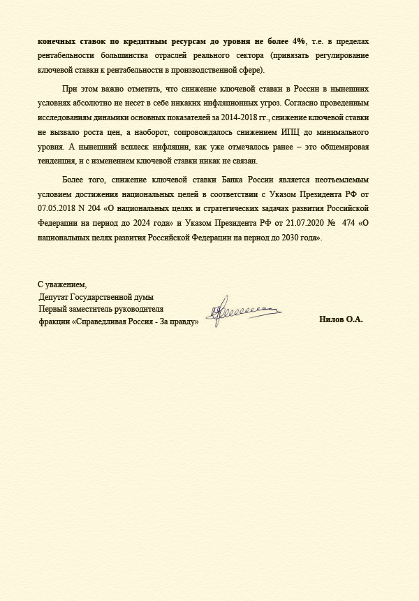 Первый заместитель руководителя фракции "СПРАВЕДЛИВАЯ РОССИЯ – ЗА ПРАВДУ" в Госдуме Олег Нилов обратился к председателю Центробанка РФ Эльвире Набиуллиной с просьбой обсудить с ГД и Правительством целесообразность и последствия увеличения ставки рефинансирования ЦБ, а также возвращения к снижению ключевой ставки.