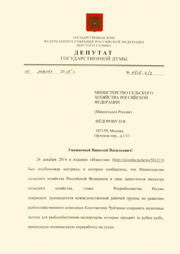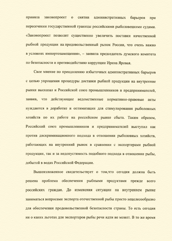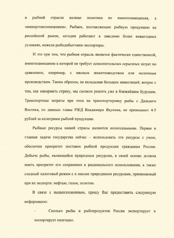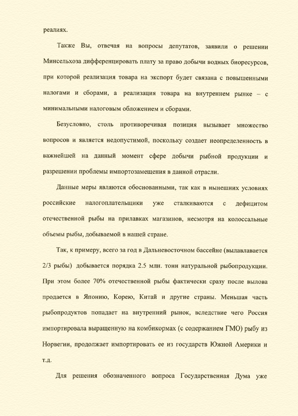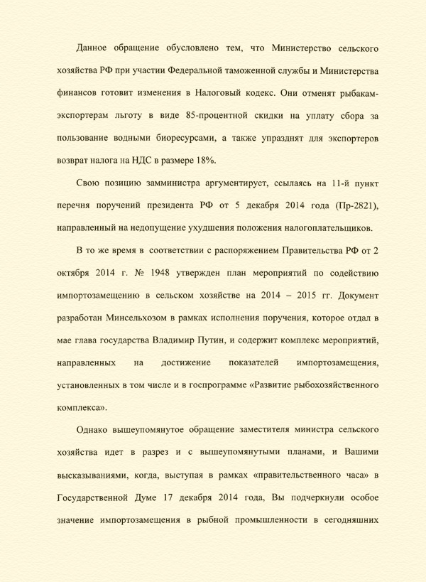 Поводом для данного обращения стали противоречивые заявления со стороны Правительства. С одной стороны, Министерство сельского хозяйства РФ при участии Федеральной таможенной службы и Министерства финансов готовит изменения в Налоговый кодекс. Они предполагают отмену льгот рыбакам-экспортерам в виде 85-процентной скидки на уплату сбора за пользование водными биоресурсами, а также упразднение для экспортеров возврат налога на НДС в размере 18%.