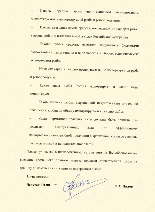 "Безусловно, столь противоречивая позиция вызывает множество вопросов и является недопустимой, поскольку создает неопределенность в важнейшей на данный момент сфере добычи рыбной продукции и разрешении проблемы импортозамещения в данной отрасли, сообщил Олег Нилов. Данные меры являются обоснованными, так как в нынешних условиях российские налогоплательщики уже сталкиваются с дефицитом отечественной рыбы на прилавках магазинов, несмотря на колоссальные объемы рыбы, добываемой в нашей стране".