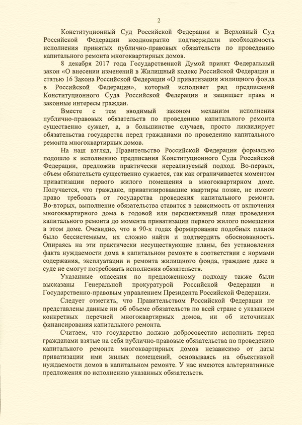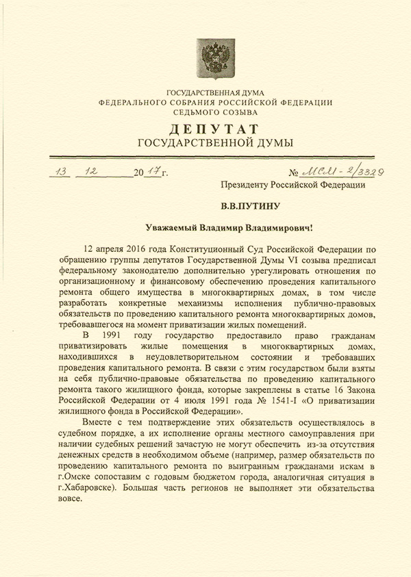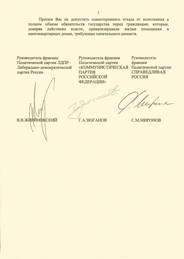 В связи с этим, руководители трех фракций Сергей Миронов, Геннадий Зюганов и Владимир Жириновский подписали и направили письмо Президенту Российской Федерации Владимиру Путину с просьбой не допустить одностороннего отказа от исполнения в полном объеме обязательств государства перед гражданами, приватизировавшими жилые помещения в многоквартирных домах, требующих капитального ремонта.