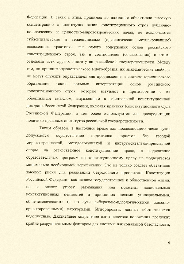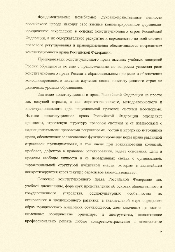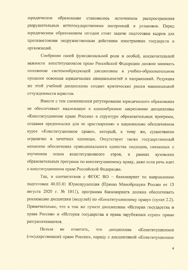 "В настоящее время происходит повсеместное внедрение дисциплины "Основы российской государственности" в высшее образование. Вместе с тем, в сфере юридического образования целеполагание этой дисциплины должно обеспечиваться на основе изучения конституционного права России как системообразующего предмета", – подчеркнул парламентарий.
