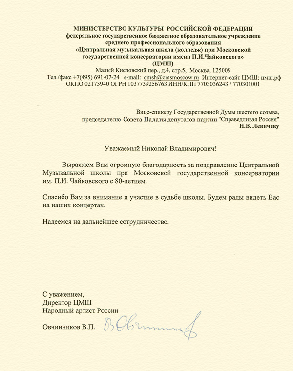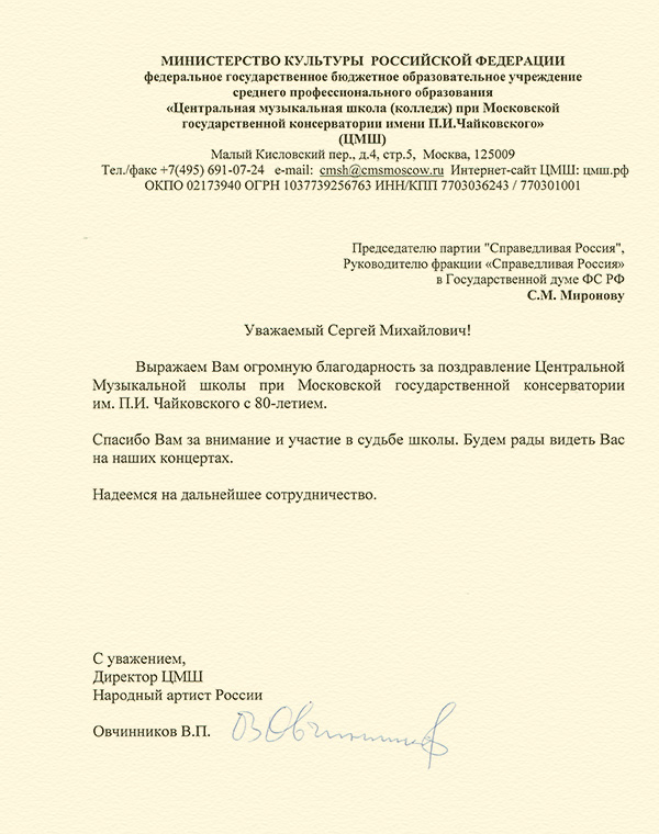 Председатель Партии СПРАВЕДЛИВАЯ РОССИЯ, руководитель партийной фракции в Госдуме Сергей Миронов и Председатель Совета Палаты депутатов Партии СПРАВЕДЛИВАЯ РОССИЯ, Заместитель Председателя ГД РФ Николай Левичев получили благодарственные письма от директора Центральной музыкальной школы (ЦМШ) при Московской консерватории им. П.И. Чайковского народного артиста России Владимира Овчинникова.