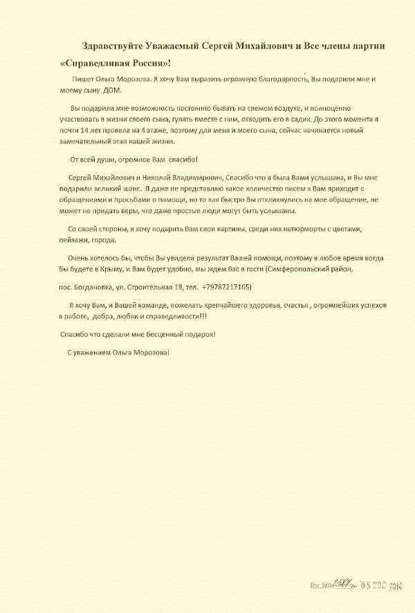 Председатель Партии СПРАВЕДЛИВАЯ РОССИЯ, руководитель партийной фракции в Госдуме Сергей Миронов и Заместитель Председателя ГД, Председатель Совета Палаты депутатов СР Николай Левичев помогли крымской художнице Ольге Морозовой, которая является инвалидом-колясочником, получить новое жильё.