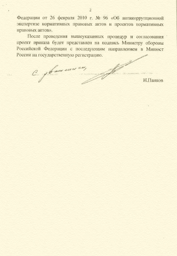 После проведения вышеуказанных процедур и согласования проект приказа будет представлен на подпись Министру обороны Российской Федерации с последующим направлением в Минюст России на государственную регистрацию.