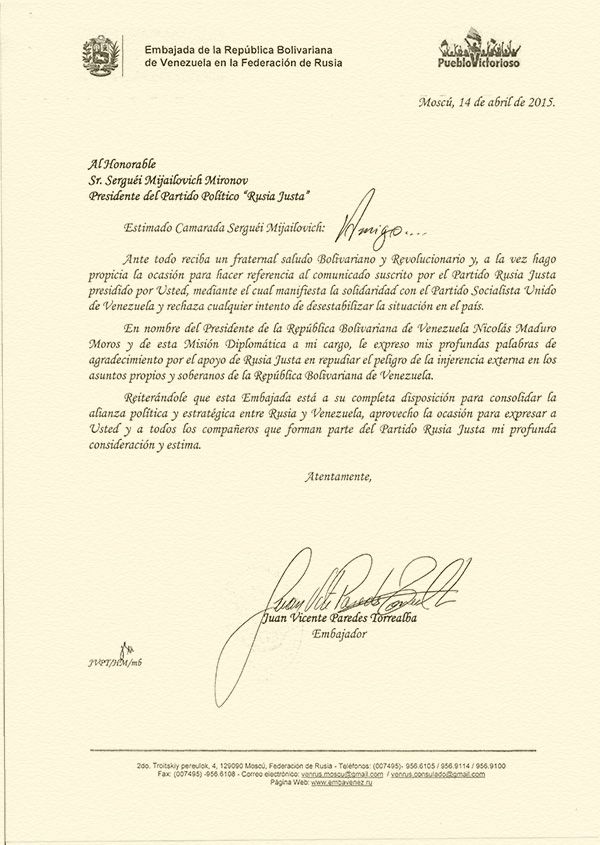От имени Президента Боливарианской Республики Венесуэла Николаса Мадуро Морос, а также от имени данной дипломатической Миссии выражаю Вам глубокую признательность за содействие, оказанное партией СПРАВЕДЛИВАЯ РОССИЯ с целью разоблачить вмешательство со стороны внешних сил во внутренние суверенные дела Боливарианской Республики Венесуэла.