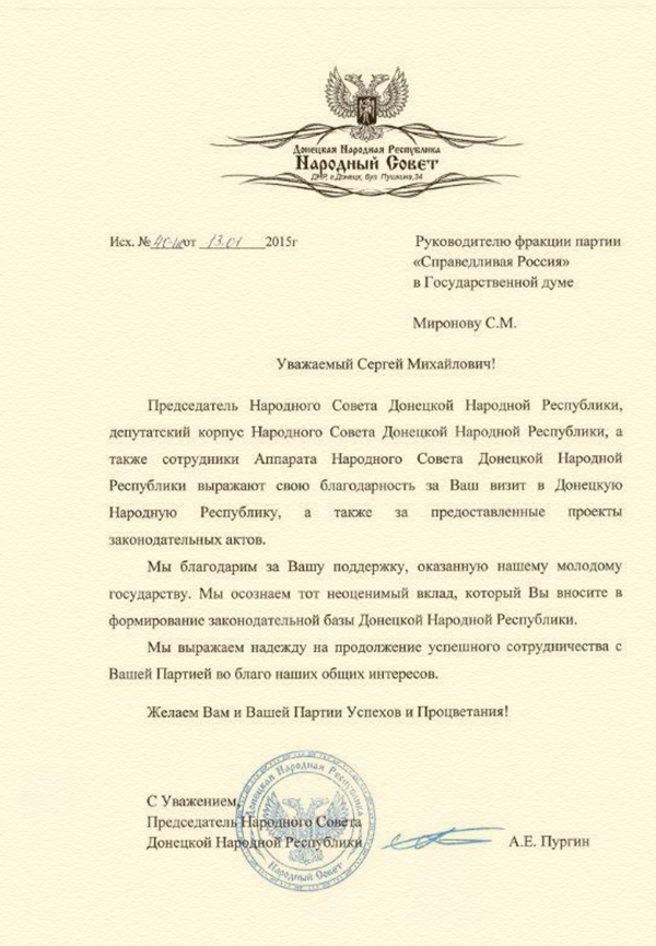 Председатель Партии СПРАВЕДЛИВАЯ РОССИЯ, руководитель партийной фракции в Госдуме Сергей Миронов получил письмо с благодарностью от Председателя Народного Совета Донецкой народной республики Андрея Пургина за свой в ДНР, в ходе которого он передал депутатам Народного Совета пакет из семи модельных , разработанных специалистами СР: