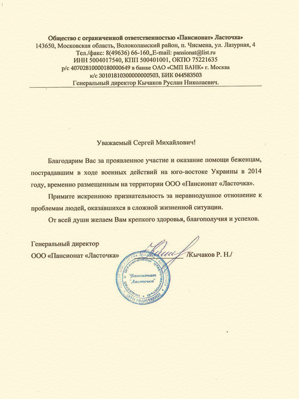 Благодарим Вас за проявленное участие и оказание помощи беженцам, пострадавшим в ходе военных действий на юго-востоке Украины в 2014 году, временно размещенным на территории ООО "Пансионат "Ласточка".