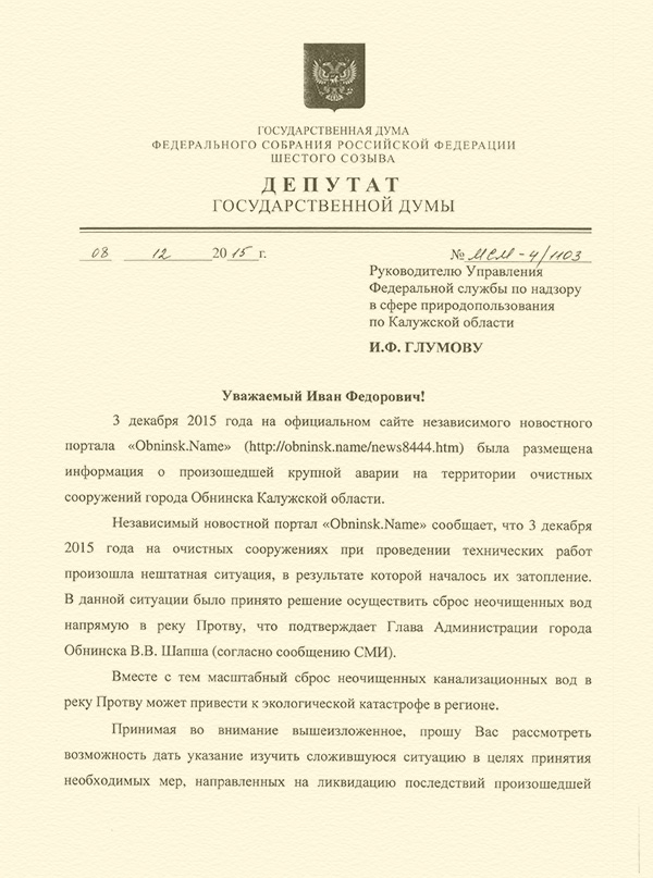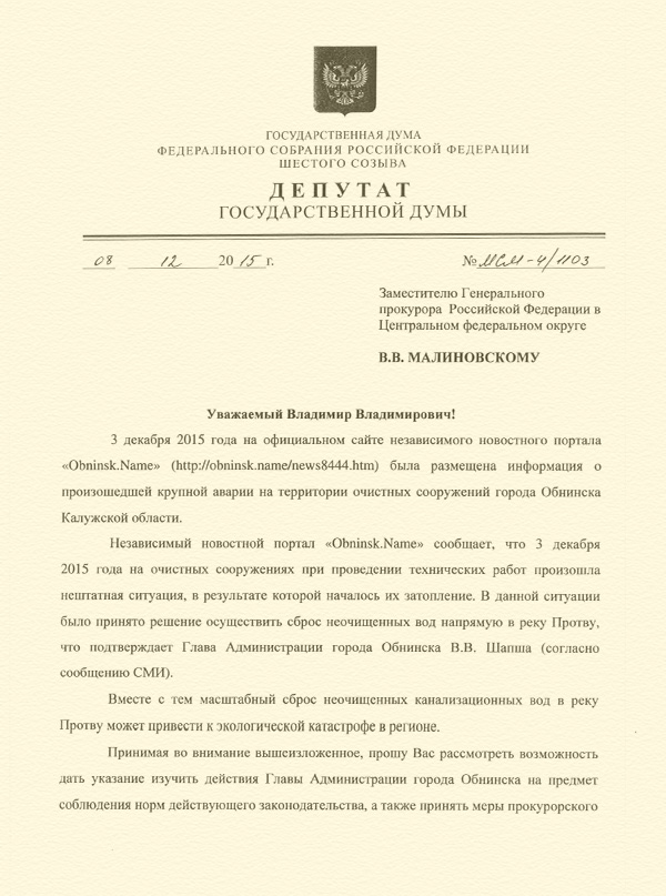 Отметим, что поводом для обращений стала информация, размещенная 3 декабря на официальном сайте независимого новостного портала о произошедшей крупной аварии на территории очистных сооружений города Обнинска. В сообщении говорится, что при проведении технических работ произошла нештатная ситуация, в результате которой началось их затопление. В данной ситуации было принято решение осуществить сброс неочищенных вод напрямую в реку Протву, что, согласно сообщению СМИ, подтверждает Глава Администрации города Обнинска Владислав Шапша.
