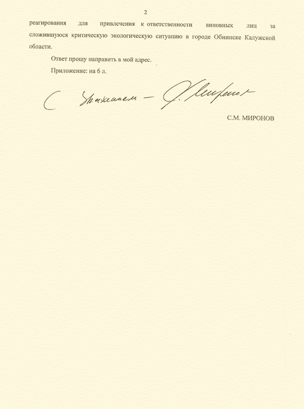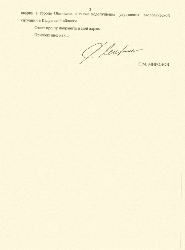 Также Сергей Миронов направил обращение в адрес Руководителя Управления Федеральной службы по надзору в сфере природопользования по Калужской области Ивана Глумова с просьбой изучить сложившуюся ситуацию в целях принятия необходимых мер, направленных на ликвидацию последствий произошедшей аварии в городе Обнинске, а также недопущение ухудшения экологической ситуации в Калужской области.