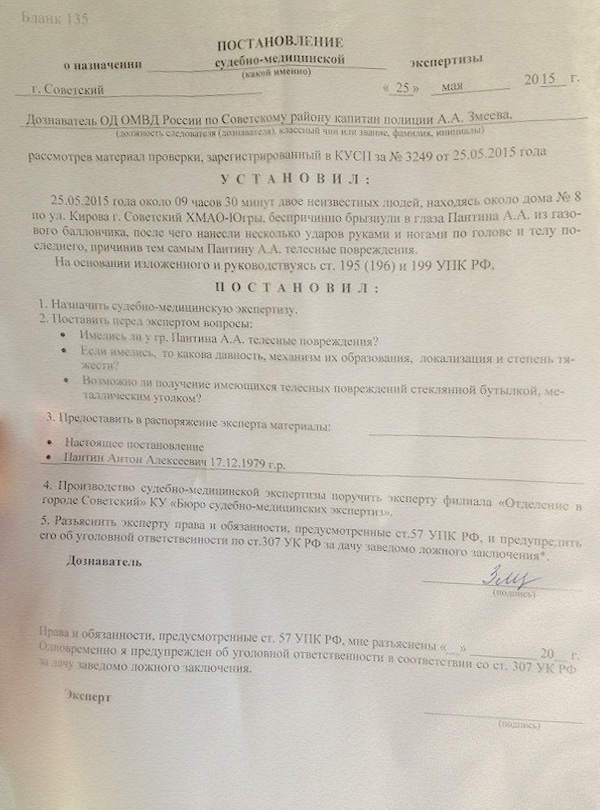 По словам Антона Пантина, двое молодых людей напали на него прямо во дворе клиники города Советский, где он проходит лечение, брызнули в глаза перцовым газом и, повалив на землю, нанесли несколько сильнейших ударов.