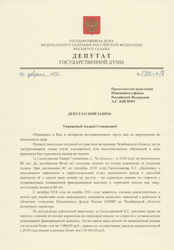 По словам политика, когда пенсионеру исполняется 80 лет, он получает право на доплату – повышенную фиксированную выплату. Но начисляют ее только со страховой пенсией. Из-за этого возникает масса вопросов. Например, челябинка Хания Газлетдинова получала пенсию по потере кормильца, соответственно, доплата в 80 лет ей не пришла. В Пенсионном фонде ей сказали, что переходить на другой вид пенсии невыгодно. Однако после вмешательства Валерия Гартунга пенсию все-таки пересчитали, повысили на пять тысяч рублей и доплатили более 170 тысяч за прошедшие годы. При этом, компенсацию удалось получить только потому, что в 2018 году пенсионерка обратилась в ПФР письменно, а не устно. Многие пенсионеры не фиксируют свои заявления письменно и из-за этого лишаются денег.