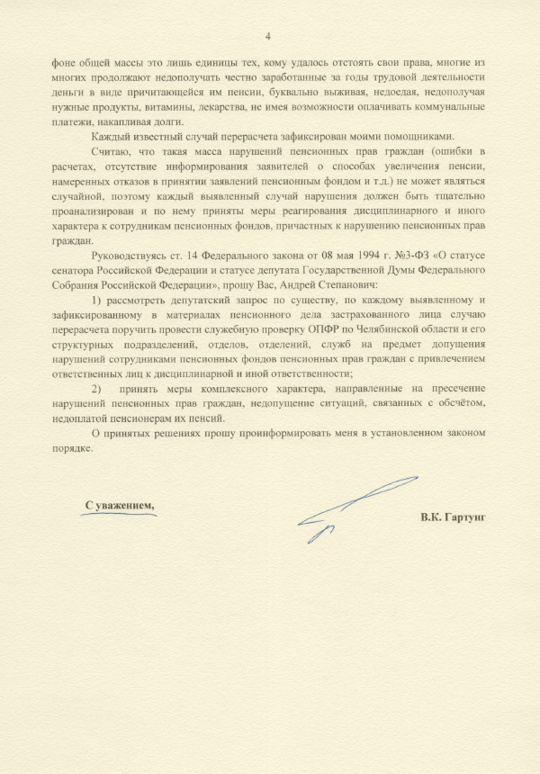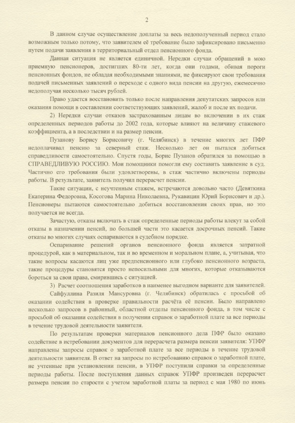 Как отметил парламентарий, стаж и условия труда влияют на специальный коэффициент, на который умножается пенсия. Кроме того, количество лет важно для назначения досрочной пенсии. Соответственно, если ПФР забудет, что человек несколько лет работал на севере или в горячем цехе, то пенсия будет значительно ниже. Так, например, челябинцу Борису Пузанову в течение 20 лет ПФР недоплачивал пенсию за северный стаж. Несколько лет он пытался добиться справедливости самостоятельно. Потом обратился за помощью к Валерию Гартунгу. В результате северные годы удалось включить в стаж через суд. Пенсия у челябинца заметно выросла.
