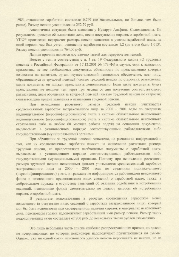 При расчете пенсии ПФР может использовать среднемесячный заработок либо с 2000 по 2001 год, либо за любые пять лет, когда человек получал высокую зарплату. Не все пенсионеры об этом знают. Поэтому часто работники Пенсионного фонда, чтобы не возиться со справками, просто считают автоматически по зарплате за 2000-2001 годы. Для многих пожилых людей этот вариант оказывается невыгодным. Так было и у Альфиды Кухарук, которая обратилась за помощью к Валерию Гартунгу. Собрав справки с мест работы, ПФР пересчитал ей пенсию по другому периоду. Размер пенсии увеличился на 764 руб. ежемесячно.