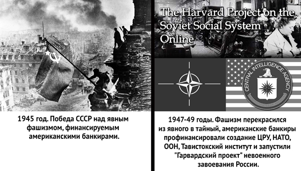Главное — понять, что «Гарвардский проект» - это не миф, как нас хотят убедить его авторы. Это - реальный проект Центра русских исследований при Гарвардском университете, появившегося одновременно с ЦРУ и НАТО. Ясно одно: США не сдались после поражения Гитлера в 1945-м. Они продолжили свое дело сразу после окончания войны, создав организации для бескровного и тайного завоевания страны методами психологической обработки, разведки (шпионажа и внедрения) и военного блока объединившихся для защиты капитализма армий. Это — ООН (создана в 1945 году), Тавистокский институт человеческих отношений (открыт в 1946 году), ЦРУ (открыто в 1947 году), Центр русских исследований при Гарвардском университете (открыт в 1948 году), НАТО (создано в 1949 году).