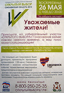 Так, в Смоленске появилась афиша, приглашающая всех граждан принять участие в предварительном голосовании под названием... «Открытый выбор» (!). Организаторы — партия «Единая Россия» и Администрация Смоленской области (!!). По сути это обычные праймериз «Единой России», проводящиеся перед всякими выборами — в данном случае, перед выборами в областную думу. Особый цинизм ситуации даже не в плагиате идеи открытых выборов, а в том, как партия власти ее пытается реализовать — голосование будет проходить на привычных избирательных участках, тайно (!!!), строго по паспортам. И в чем же открытость выбора?