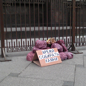 На днях у здания Государственной думы в Москве, прямо у КПП появилась груда «камней» (на самом деле, похоже, бумажные муляжи) и табличка «Время собирать камни». Неизвестный автор, видимо, намекал, что настало время, когда чиновники ответят за все свои деяния. Проходивший мимо сторонник партии «ВОЛЯ», порадовавшись лаконичности и образности высказывания, запечатлел эту инсталляцию .