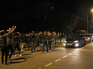 В толпе звучат националистические лозунги. Много пьяной молодежи. В настоящий момент большая группа людей движется к расположенной неподалеку овощной базе. ОМОН пытается преградить им путь, пока безуспешно.