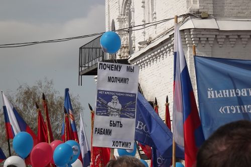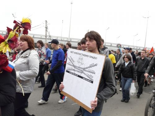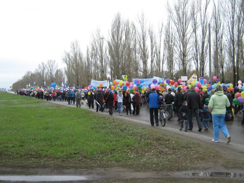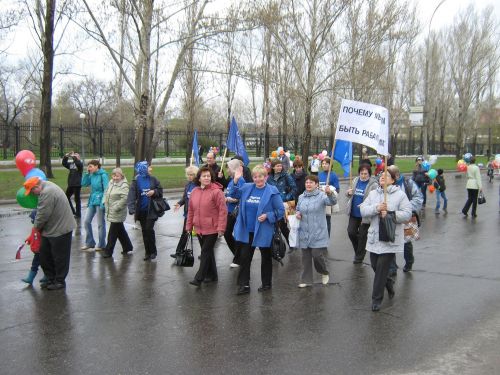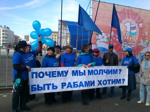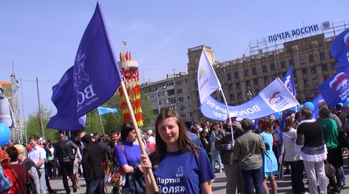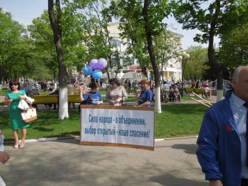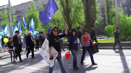 В Белгороде сегодня состоялось шествие трудовых коллективов и митинг, организованные областным профсоюзом. В демонстрации принимала участие только одна партия - "Единая Россия", участие других партий в мероприятии, мягко говоря, не приветствовалось. В этом убедились представители партии "ВОЛЯ", которые решили принять участие в общегородском празднике. В итоге одного из сторонников партии пытались задержать за развернутый лозунг: "Сила народа в объединении, выбор открытый - наше спасение!". К счастью, проходивший мимо губернатор Белгородской области Евгений Степанович Савченко подметил, что мы все находимся в одном правовом поле. Видимо поэтому полиция отпустила активиста партии.
