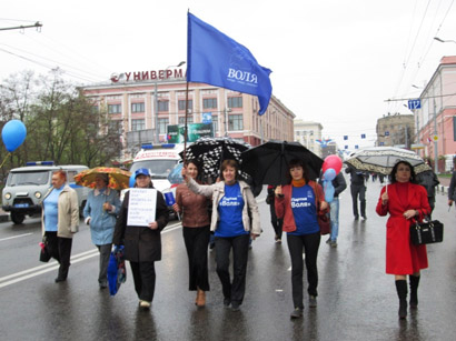 Несмотря на дождь, региональное отделение партии «ВОЛЯ» в Орле приняло участие в общегородских акциях. Вооружившись смелыми лозунгами, флагами, синими шарами и зонтами, партийцы прошли шествием от гостиницы «Орел» до сквера Маяковского. Навстречу им спешили вымокшие сторонники партии власти, которые были явно не в восторге от необходимости отбывать повинность на шествии.