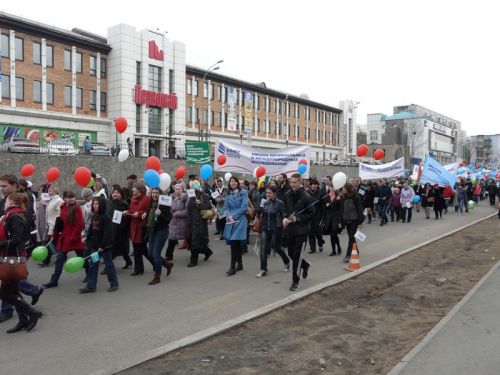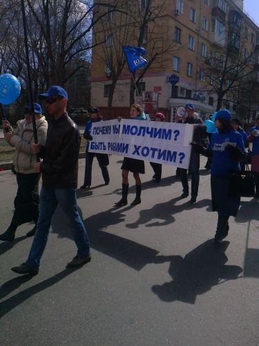 Первомайские демонстрации сегодня прошли и в Хабаровске, где принято отмечать шествием двух колонн. В первой идут губернатор, мэр, представители краевой и городской администрации и «народ», привлеченный с помощью «административного ресурса». Во второй колонне, которая идет по параллельной улице против движения первой, идут представители различной оппозиции. В этой же колонне и прошла хабаровская "ВОЛЯ". Флаги и атрибутика сапфирного цвета ярко выделялись на общем фоне и привлекали внимание горожан и участников шествия. Активисты партии так громко и дружно скандировали свои речевки, что другие демонстранты просили дать возможность проявить себя. Лозунг «Почему мы молчим? Быть рабами хотим?» стал одним из основных на первомайской акции.