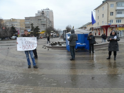 В Белгороде двое молодых людей пытались сорвать пикет сторонников партии «ВОЛЯ». Рядом со стационарным пунктом движения «Выбери открыто!» встал молодой человек с плакатом «Не вступай в секту «ВОЛЯ». Неподалеку от него встал второй с видеокамерой и стал снимать происходящее. Вероятно, провокаторы должны были отчитаться своим заказчикам о том, что заказ выполнен. Сами ребята улыбались, наверно, сочли свою выходку остроумной.