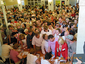 У ДК на площади Кирова люди занимали места еще с вечера 14. Уже с 4 утра сегодняшнего дня жители стояли с лозунгами и транспарантами, призывающими голосовать против принятия. Активисты старались не допустить в здание граждан, которых согнали туда административным ресурсом. Например, две сотни футбольных фанатов, которых, по сведениям граждан, также должны были привезти в ДК. К 9 утра здесь собралось около полутора тысяч человек. Процесс регистрации затянулся и тут же вскрылись нарушения: гражданам, которых записывали участниками на слушание не присваивали регистрационные номера, хотя были обязаны, листы реестра учета присутствующих не сшивались. Лишь после бури негодования представители администрации распорядились проставлять номера участников, однако справедливость восстановлена все же не была - нумерация велась с нарушением, многих вообще не посчитали. Во время слушаний, со слов «дачников», на улице представители администрации собирали голоса прохожих, тех, кого подвезли на автобусах, но места в зале которым уже не хватило.