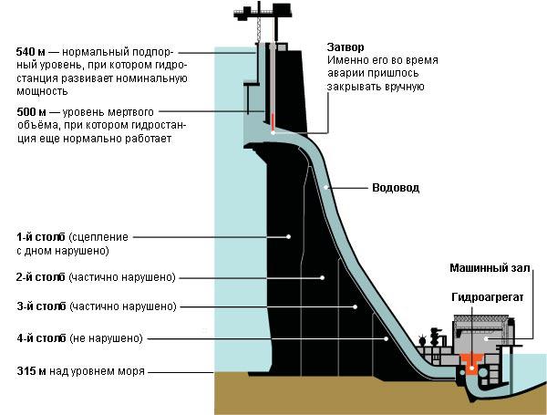Бывший начальник научно-исследовательского сектора КБ "Гидросталь" Минэнерго Павел Хлопенков: «Плотина интенсивно размывала свое основание, ослабляя его сцепление с дном русла. Из-за нерасчетных деформаций в теле плотины образовались трещины, куда устремилась вода под высоким давлением». Некоторые трещины размером от берега до берега. Основание плотины отошло от дна русла.