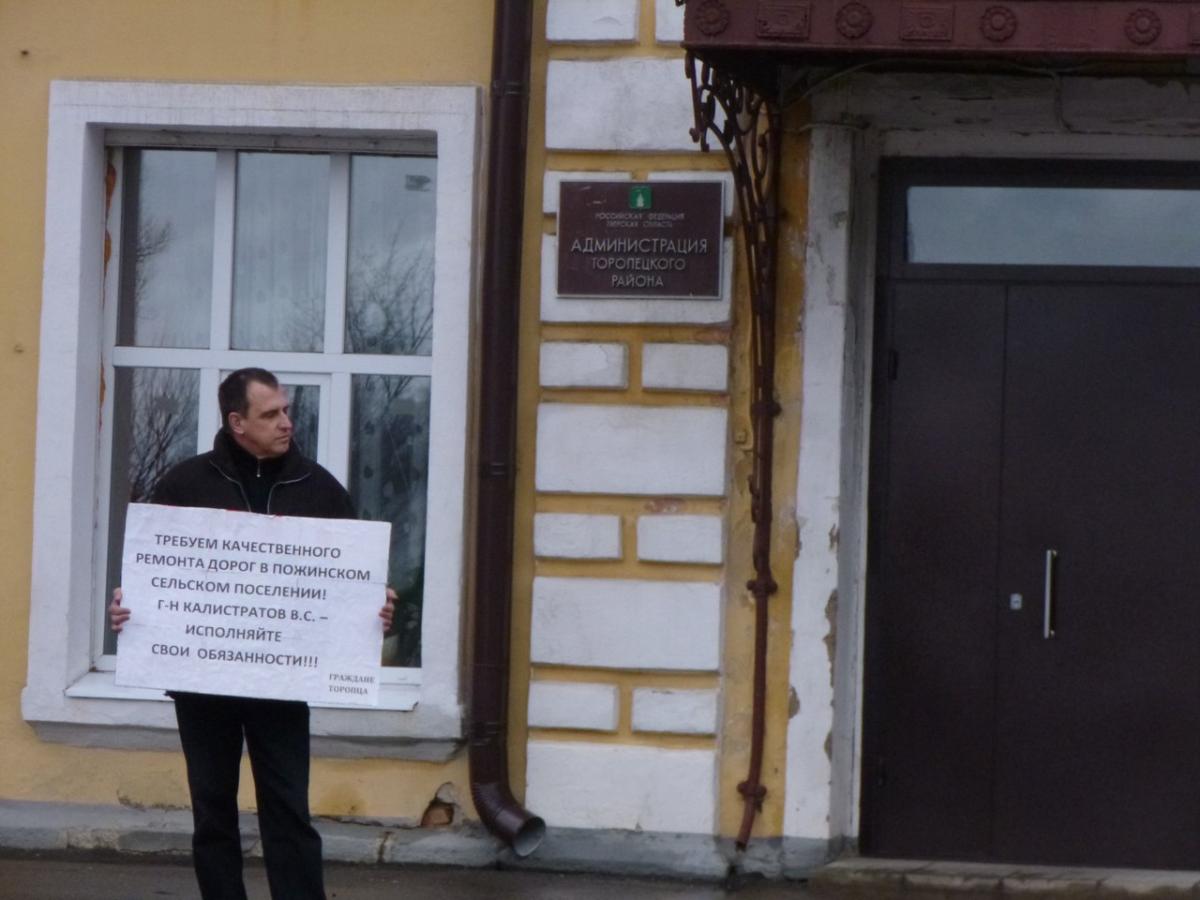 Акция Тверского ЯБЛОКА стала ответом на деятельность Василия Калистратова, главы Пожинского сельского поселения, при котором окончательно разрушились дороги, появились проблемы с уличным освещением.