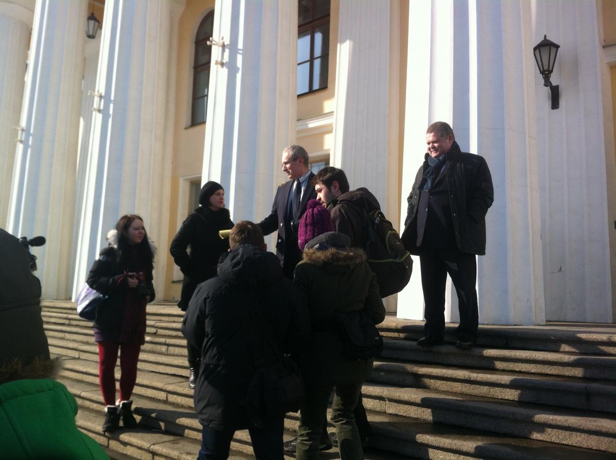 В назначенное время у парадного входа в университет «яблочников» уже ждали проректор Горного Анатолий Суслов, пресс-секретарь вуза, известный в прошлом «телекиллер» Сергей Чернядьев и сотрудники юридического отдела.